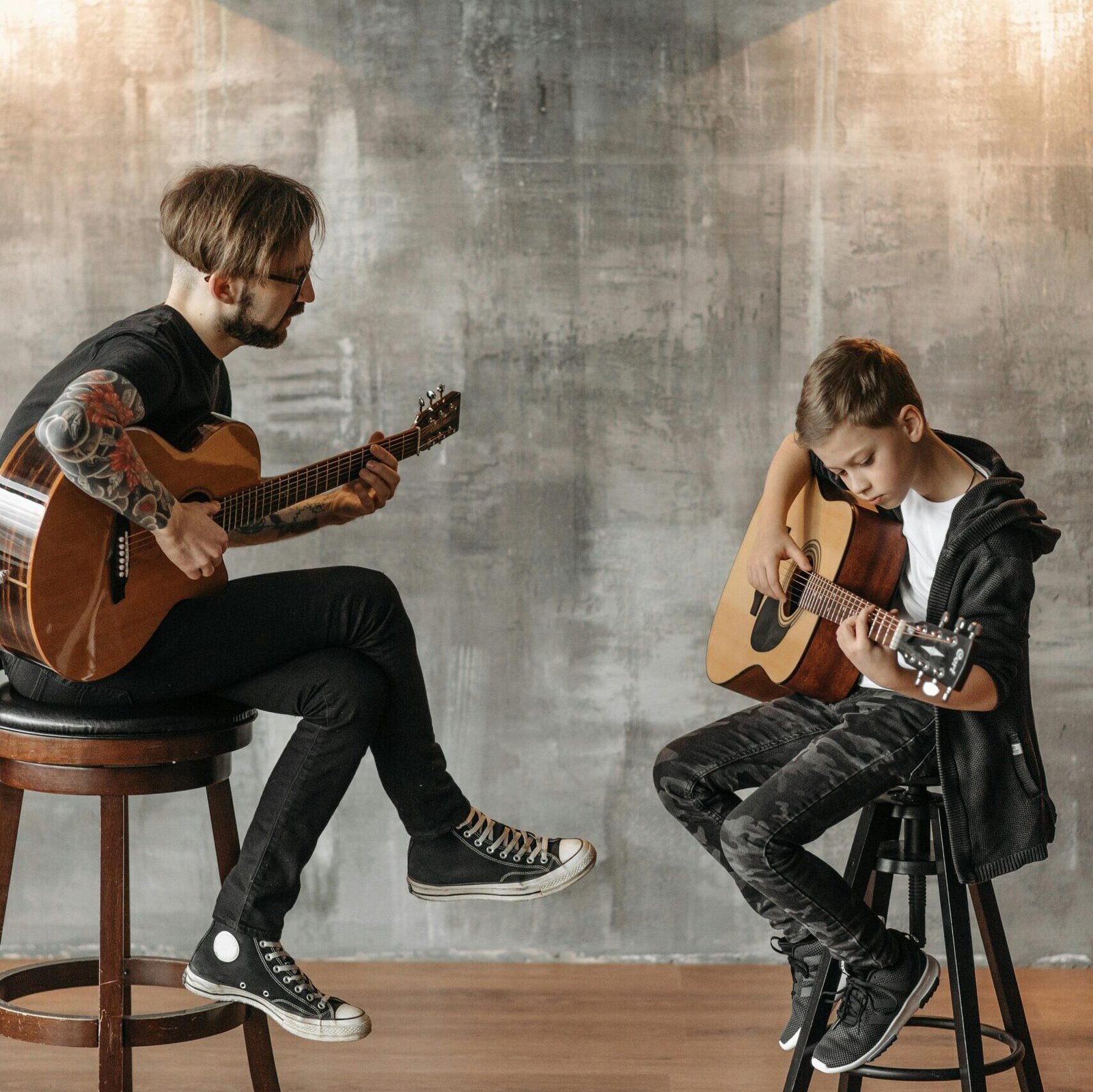 Nuestros alumnos aprenden a leer partituras desde el primer día con canciones muy sencillas. El aprendizaje se complementa con ritmos con acordes, y pequeños riffs o melodías en forma de tablatura. El repertorio incluye desde piezas clásicas hasta temas originales propios. La enseñanza no sólo es individual sino que también se practican canciones en grupo tanto al unísono como en distintas voces.